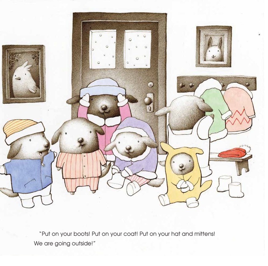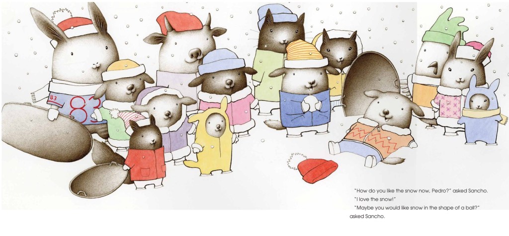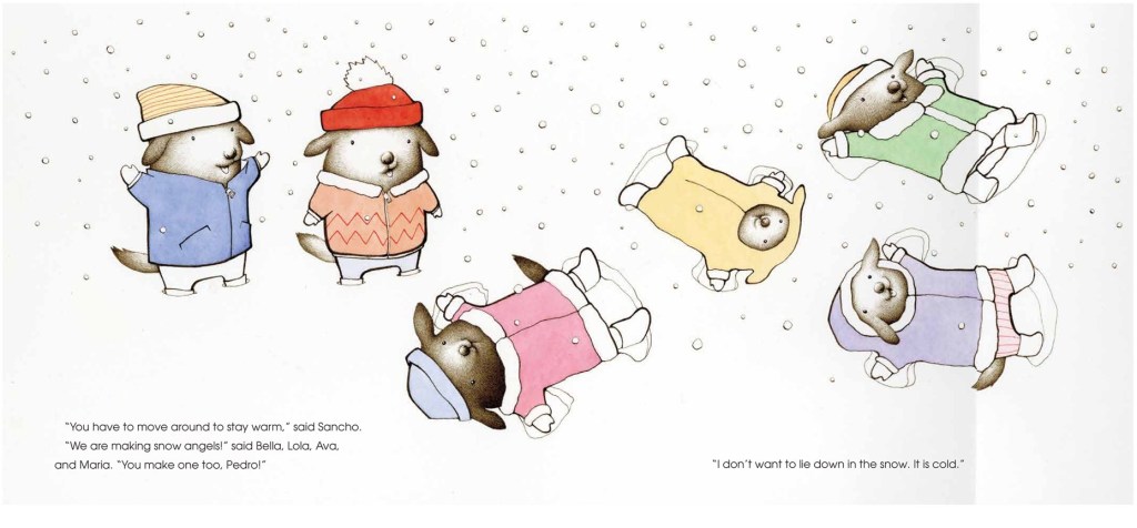 The scene then moves from domestic calm to exuberance, as everyone but Pedro gets ready to emerge from the house and play. They dress in puffy snow gear and make snow angels. Sancho helpfully points out that moving around is key to staying warm, but Pedro repeats his reservations. Readers may identify with his hesitancy, or feel frustrated by his obstinance. Those different possible reactions frame the entire story.