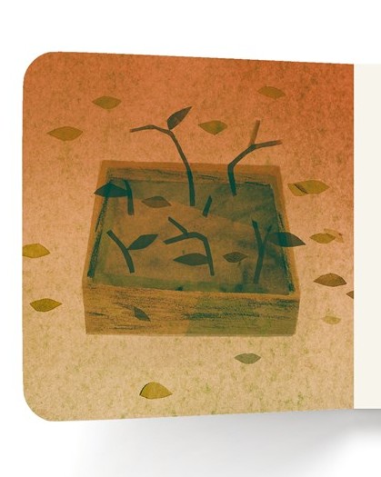 The gift and box work together. Mayer emphasizes the cooperative aspect of their task: “Gift’s purpose was to delight. Box’s purpose was to protect.” Their long journey may be important, but it is also tedious at times, involving a lot of waiting. There is even some danger involved. There are collage elements in many of the pictures, reflecting the artist’s use of several media. (“The illustrations were created using rolled printmaking inks, crayons, handmade stamps, and paper collage, then assembled digitally.) Busy city streets are a context for the gift’s voyage, with earth and jewel-toned vehicles passing apartment buildings. The human figures have an Ed Emberley-style simplicity.
