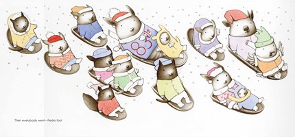 Other neighborhood children join in. There are birds, cats, and cows, united in their happiness. Abby describes the sensation of feeling snowflakes on your tongue, to which Pedro predictably answers, “It tastes cold.” Eventually, having voiced all possible objections, he begins to participate in sledding. There is plenty of white space separating the pictures, giving a sense of movement. When Pedro decides, or admits, to loving the snow any sense of surprise may be either muted, or genuinely impressed by the change in the visitor’s attitude. Any child, or adult, who welcomes snow, even while acknowledging its potential nuisances, will appreciate this book.