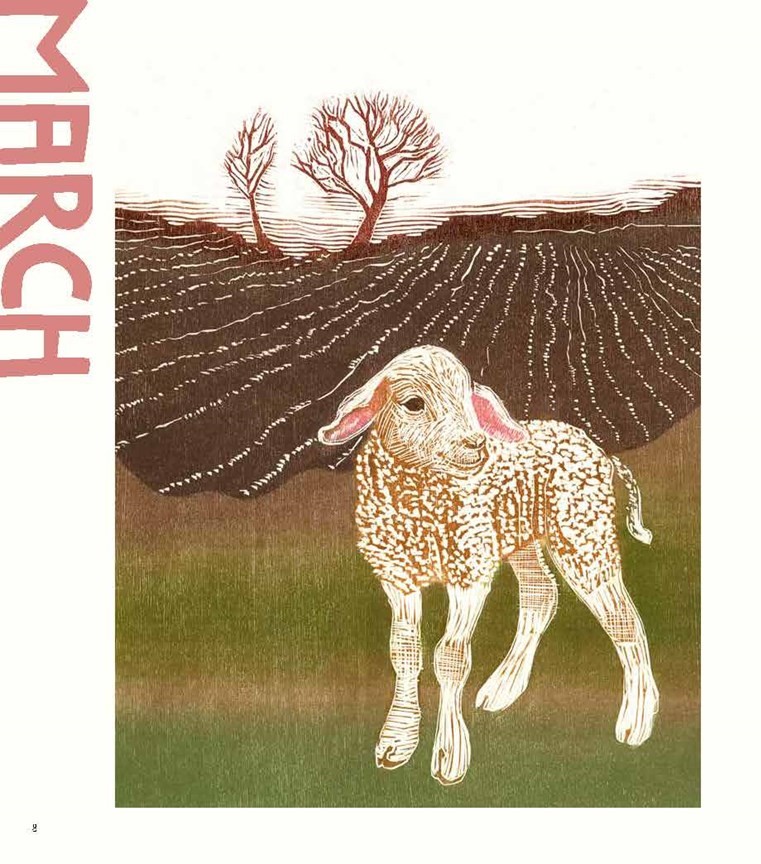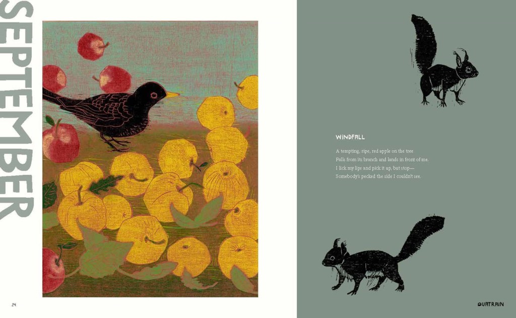 The seasonal page and poem are followed by a page identifying the month, in larger font. This is one of several interesting artistic choices which are not obvious. Do months require more attention than seasons? The variety ensures that reader experience each page and poem as something new.