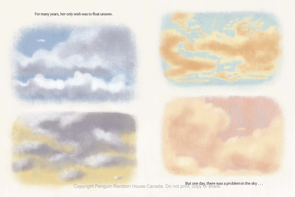 When the book opens, Kumo is so pale as to be almost invisible. As Kyo Maclear narrates (I’ve reviewed her other works here and here and here and here and here), “for many years, her only wish was to float unseen.” Yet circumstances change and she adapts, if, at first, reluctantly. “Her mind was heavy with doubt” may seem an intense statement of consciousness to a child, but it makes sense. She is frightened, then trapped in a tree. A friendly kite, not a cloud by cloud-adjacent, helps her out. So does the wind, and a lake, fields, and “singing glaciers.” The natural world is her ally. But When Cumulus feels “under the weather” and Cirrus departs for a cloud convention, she is worried.