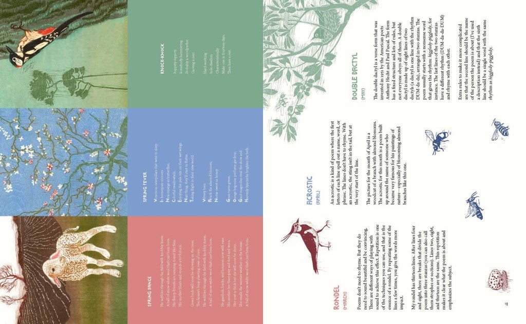 Each season begins with haiku. Every month has a poem in a different verse form. Following the twelve months and their poems, there is a section read by turning the book vertically. There are three columns of text and pictures, which are actually the same ones that appeared earlier, encouraging access to the description of the form that accompanies each poem here. Instructions for how to write in each form are not provided as a formula or a graphic, but they may certainly be used that way by aspiring poets.