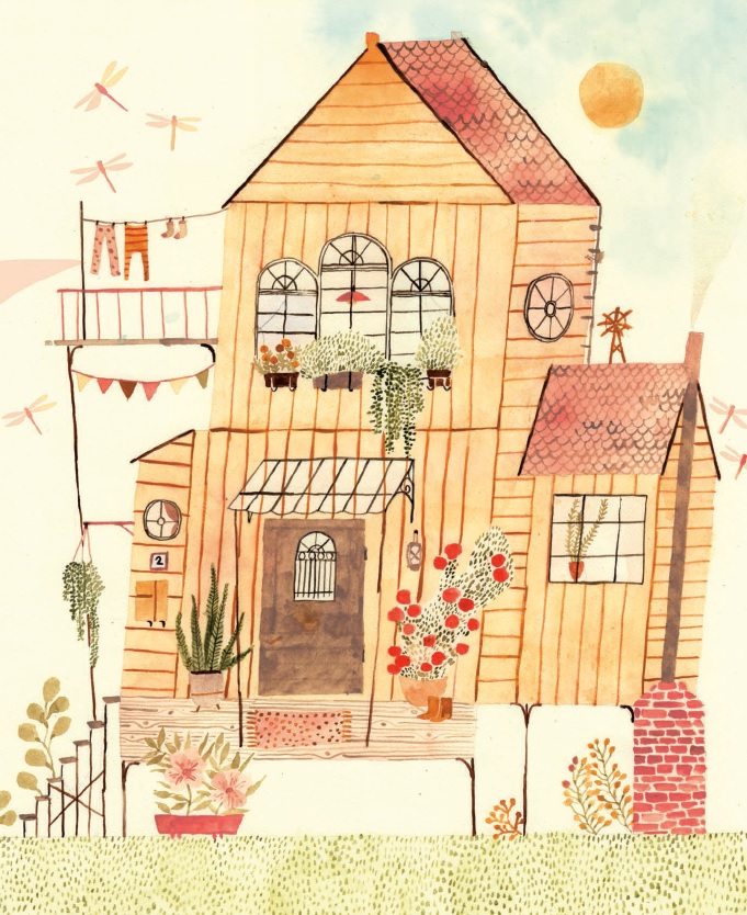 His life is radically altered when a grandmotherly woman, Madame Odette, comes to live next door. All of a sudden, pink green, and red take over the pages, as Madame Odette is the loving caretaker of flowers, dragonflies, and potted plants. If the bear is solitary, Madame Odette is the opposite; “She lived in a/cheerful world of color and sound.”