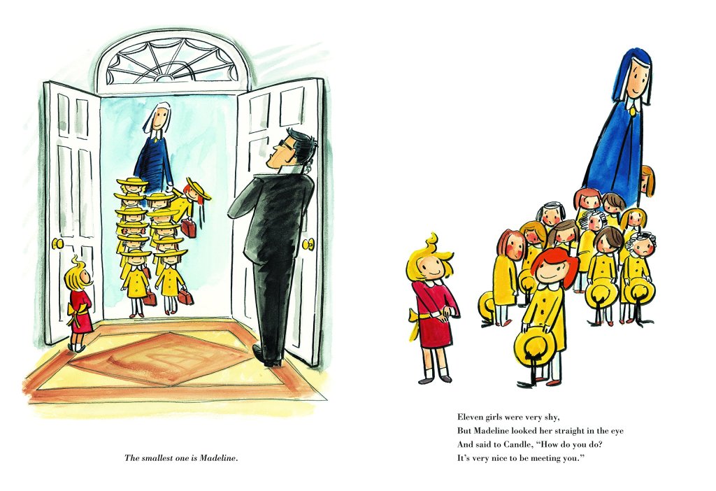 Some of the pictures are full of bright colors, while others repeat the yellow, black, and white of Bemelmans’ original series. Wearing a red dress, Candle stands happily surrounded by her friends dressed in leaf green. They draw, play with dolls, roller skate, and otherwise expose her to the kind of freedom which she has never experienced.