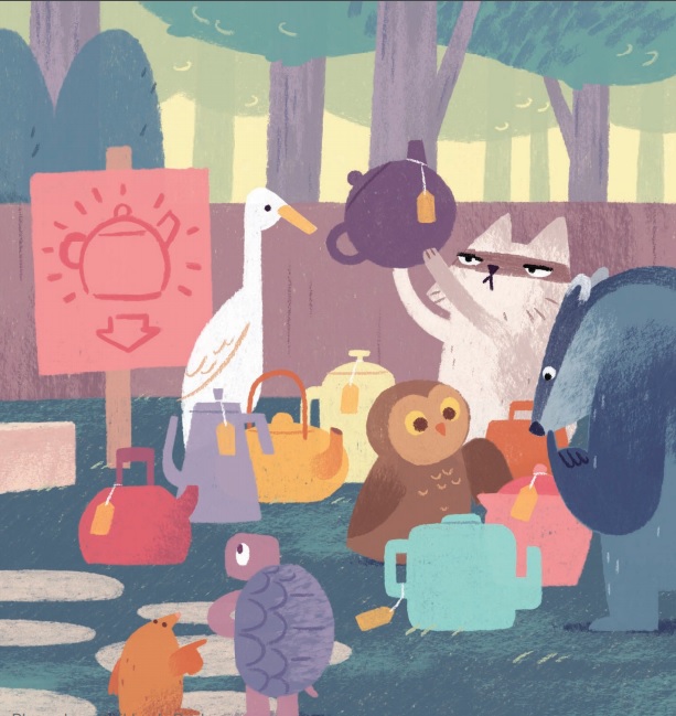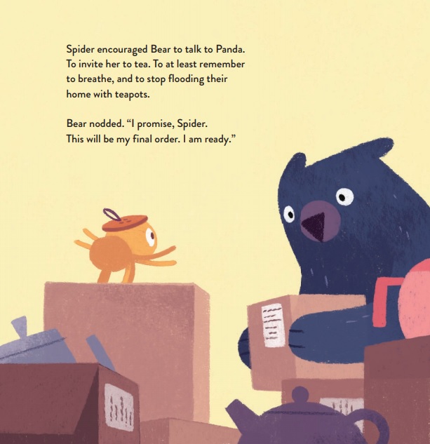 One of the keys to this child-friendly plot is that Spider both empathizes with Bear and occasionally loses patience. When he first observes that his friend is “speechless” as Panda arrives with another teapot, he feels sorry for Bear. But when Bear persists in repeating the same ploy of ordering teapots without speaking to his soulmate, Spider “felt less sorry.” Waiting for his friend to change is not going to bear fruit. So, Spider intervenes with some practical advice and encouragement. The picture of a tiny spider gesturing with some of eight limbs while standing on top of carton, as Bear listens timidly, is a reminder to children that being bigger does not guarantee superior wisdom or confidence.