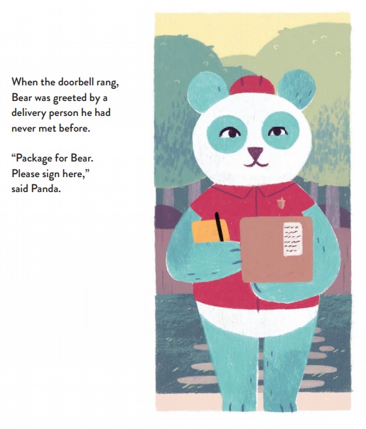 If you are familiar with Jacob Grant’s two earlier books about Bear, then you know that he has a loyal best friend and roommate, Spider, who helps him to navigate difficult emotions. (In Mike Curato’s wonderful Elliot books, a smaller animal, Mouse, also helps his large but vulnerable friend.) Bear’s eagerly awaited delivery of a new teapot turns into something more when he finds himself mysteriously attached to Panda, the delivery person who shows up with the item. Love-at-first-sight leaves Bear dumbfounded, “He stood there, nearly the dropping the teapot,” but his savvier friend seems to understand what has happened, “Spider found it all rather funny.”