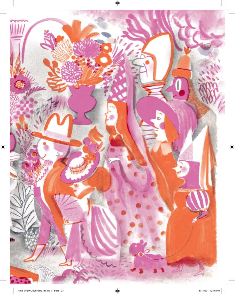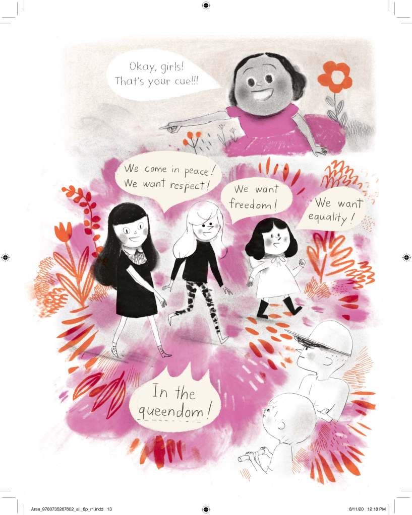 At that point, the world of fantasy steps in. As in another children’s classic, Harold and the Purple Crayon, the children become their own creation. Arsenault’s pink and red-hued cast of knights, damsels, and horses ask the reader to step back from the conflict and enjoy the show. Everything looks promising, especially when Maya asks, “Who will conceive of this land of freedom, respect and equality with me?!!!” But then reality intrudes. Maya apparently thinks that respect and equality are a one-way street. Not until she concedes that actors, workers, and kids have rights (“Good point, musketeer.”) does true equality enter her queendom. Any child who has ever been pushed around by a peer convinced of his own superiority will cheer along, throwing festive objects into the air with joy.