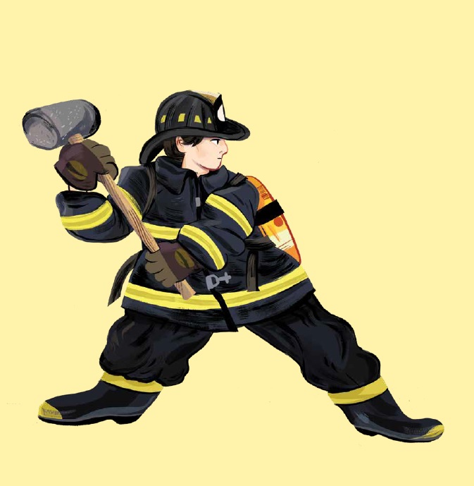 The front and back endpapers of the book are a wonderful preview and summary of its themes. Red drawings against a light-yellow background simulate fire. Icons of the story include flames, city buildings, fire-fighting tools, and a photograph of young Brenda adjacent to a firefighter’s helmet. The moving dedication page includes a scene, later repeated in the text, of Brenda studying for her firefighter’s exam. She is the totally authentic person we will meet in the book itself. A pencil behind her ear recalling pre-technology days, she points to the lines in a book while making notes with her other hand. A cup of coffee and a bunch of bananas indicate that Brenda is dedicating her personal time to the pursuit of a goal.
