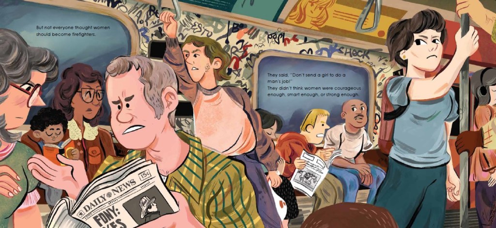 Jessica Rinker and Meg Hunt’s depiction of Berkman’s ordeal does not soften the hard facts. Angry and threatened men bully their colleague. Even tough New Yorkers, portrayed reading The Daily News on the subway, are full of snide skepticism at the possibility that women could be first responders to the city’s needs. Although Berkman passes the competitive exam and is welcomed to the ranks of the FDNY, her triumph is marred by the entrenched hatred of her colleagues and even of the people she is committed to serving. One two-page spread is truly heartbreaking, reporting that “Some of the other firefighters were cruel. They pulled a lot of pranks. But these pranks were not funny tricks. They were mean and dangerous and sometimes threatened the women’s lives.” There is a lot left unsaid; adults reading with children can fill in the gaps, and also address exactly why so many people opposed the inclusion of women in a department dedicated to public service.