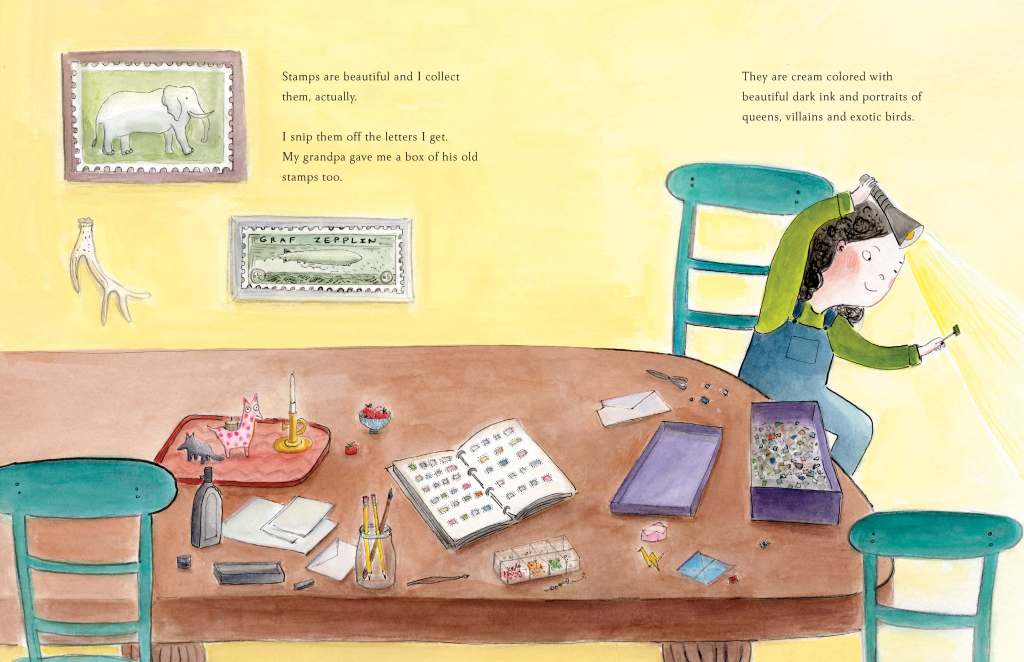 The book’s title is a straightforward declaration, and it presents a mystery: why? Bianca knows exactly what she likes, even loves: writing letters and collecting stamps. Why is the lady behind the post office counter so terrifying? Abbott doesn’t attempt to invent a logical answer to this question. We meet Bianca in a two-page spread featuring postage stamps one side, including a U.S. airmail commemorative honoring Amelia Earhart and the famous Penny Black, the first British prepaid stamp for mailing letters. Bianca stands on a small stepstool to reach the stamp album on a crowded set of shelves; she is obviously determined and purposeful. She’s not singularly obsessed with one activity, though, as we can see from both the other items on the shelves and those on her table: a polka-dotted llama candle holder, some origami in progress, compartments of colored beads. Bianca is an artist as much as a collector. Her stamps represent not only objects to acquire; “They are cream colored with beautiful dark ink and portraits of queens, villains and exotic birds.”