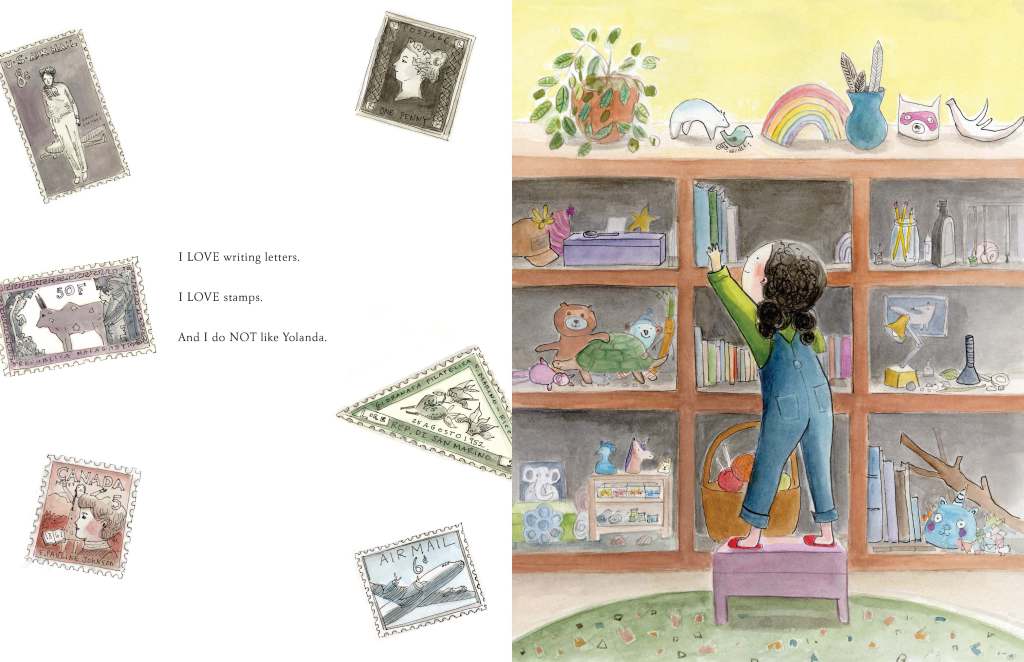 It’s always exciting to encounter a children’s book that is truly original. Zoey Abbott’s new picture book, I Do Not Like Yolanda, did not arrive out of nowhere. Of course, it has precedents in other books that deal with children’s baseless, yet still very real, fears about different people or phenomena. It’s not the first children’s book to feature postage stamps in many of the pictures; the great author and illustrator Rosemary Wells has a used these miniature works of art in many of her stories. But Bianca, the young heroine of Abbott’s book, and Yolanda, her mistaken source of anxiety, are one hundred percent individuals. Here is a child living in a contemporary, diverse, San Francisco neighborhood, as we can see both on the return address of her envelopes and the vibrant urban neighborhood of the pictures. She is also an avid philatelist (stamp collector), and an all-around artistic spirit. Yolanda is a devoted employee of the local post office, but Bianca, as children will, has developed a frightening fantasy about this kind woman who sells her stamps. Children will absolutely relate to the way Bianca’s mind works.
