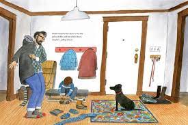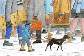Snow in the city sometimes begins inside, when you first see it outside the window. Illustrator Gary Clements (also a Toronto resident) balances all the perspectives from which snow appears. The beginning scene of father putting on coats and boots shows no snow at all, just the white door to their home ready to open. We see snow from the eye level of the boy and his dog, with adult feet walking in boots, and snow viewed from the window of a bus, although some of the passengers are absorbed in their phones.