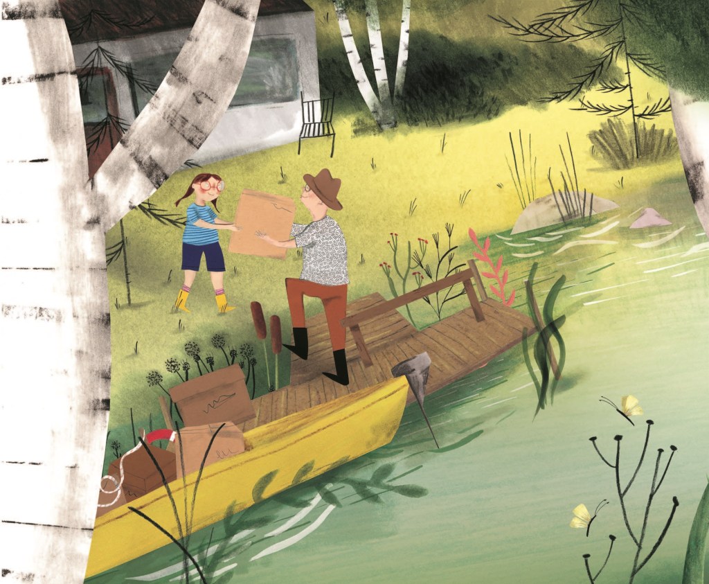 When Kate’s mother arrives and embraces her, her simple statement about Kate’s summer experience, “Just like when I was a girl,” is full of implicit meaning. Kate confronts some obstacles which her mother did not, but the two share a deep, common bond. The final image sums up that connection. Mother and daughter look out the window towards the world, and also appreciate Kate’s unique identity, in the form of a wooden miniature boat and girl framed in the center of their view. Out Into the Big Wide Lake is a summer outing, or one for every season, to share with our children.