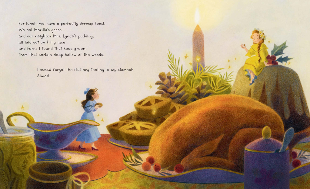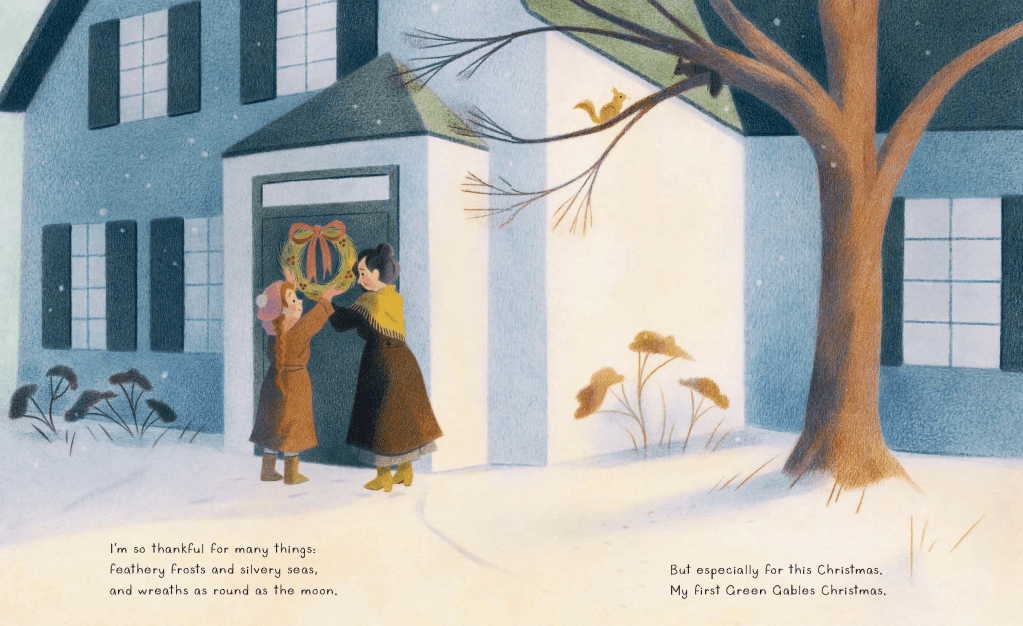 George’s text is both playful and poetic, showing deep respect for children’s ability to understand metaphor: “I’m so thankful for many things,/feathery frosts and silvery seas/and wreaths as round as the moon.” Anne and her bosom friend, Diana, are both Avonlea residents eagerly awaiting the Christmas holiday, and also the incarnation of Anne’s admiration of fairies.