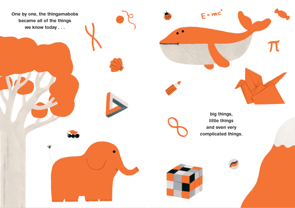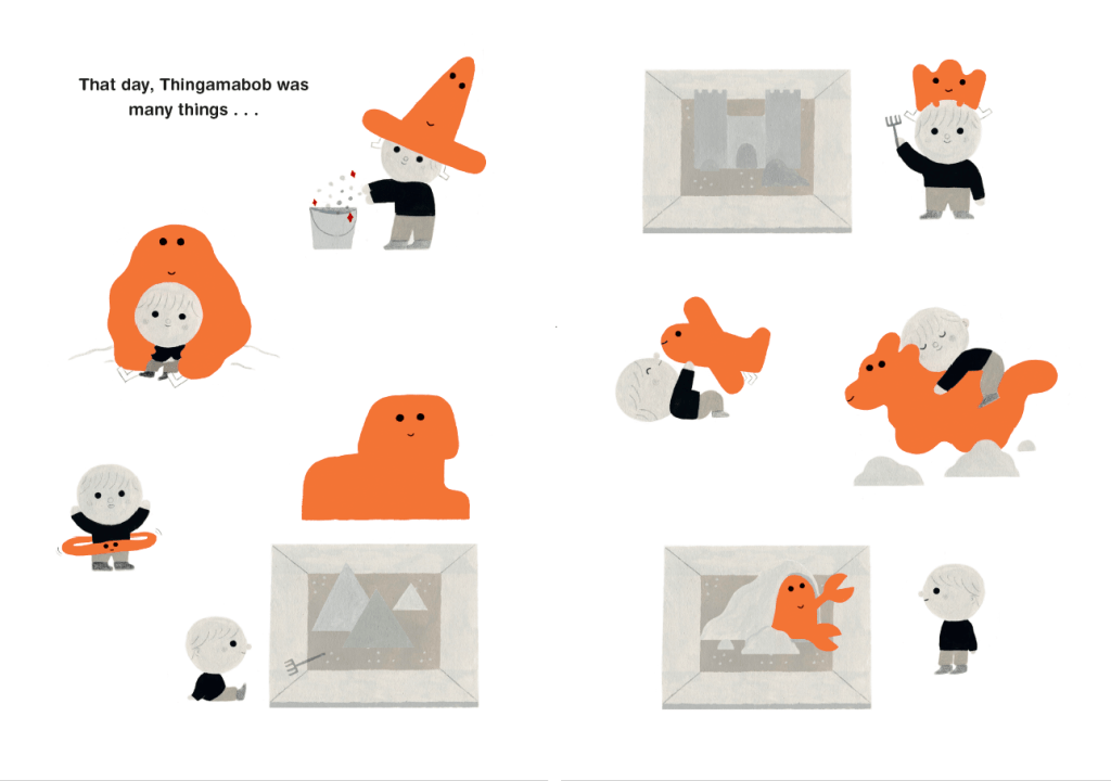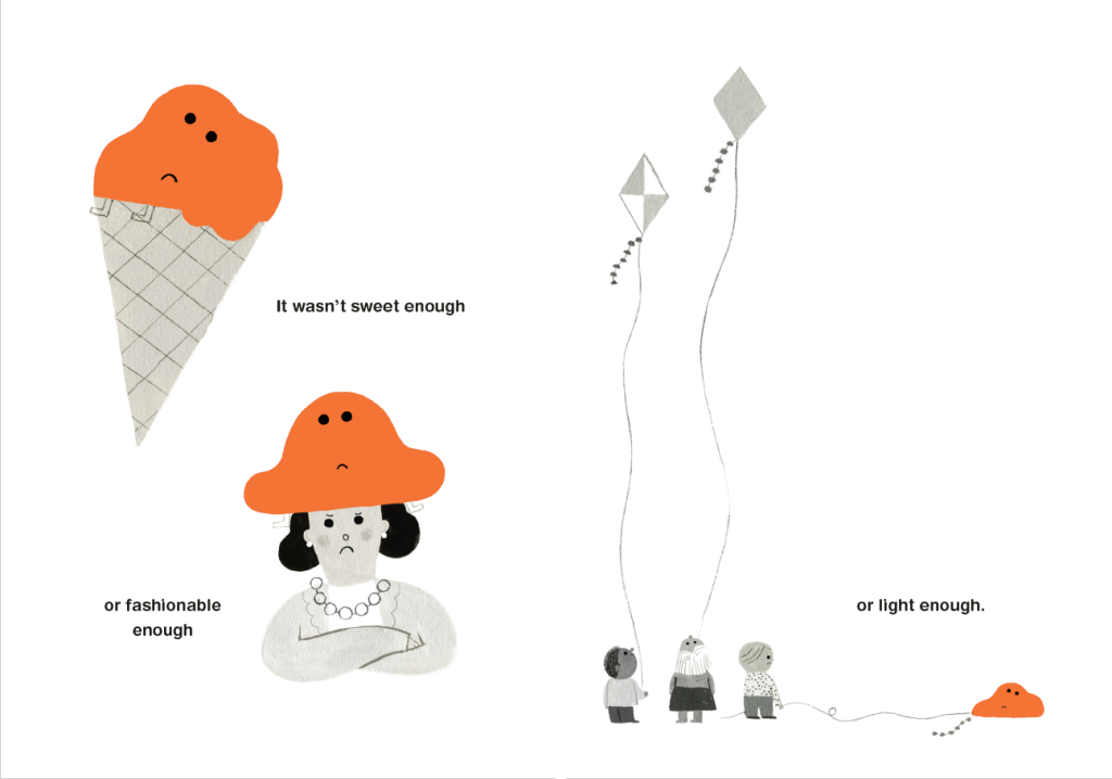 Careful composition, as in her other books, presents Coppo’s reader with a clearly defined space. Dark font against a white background, and a limited color palette featuring the orange thingamabob, show how different he is from the gray and black figures surrounding him. An uneasy chair, an awkward hat, a failed kite, an inadequately rounded basketball, even a question mark, express the problem of someone who just want to fit in somewhere. “What’s the use of this thingamabob?” readers are invited to ask.