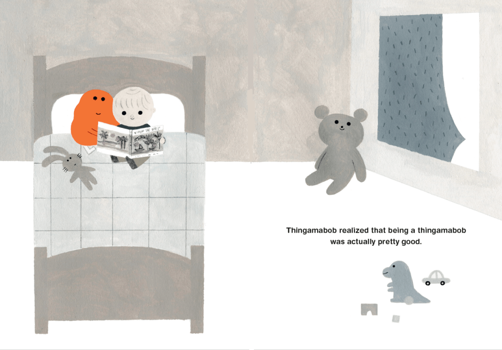 Coppo shows a deep connection to the way children think, a quality she shares with best authors and artists for young readers. When the thingamabob curls up to share a bedtime story with his new friend, the book they share is Coppo’s homage to Maurice Sendak, an unmatched example of the adult who remembers exactly what it meant to be a child. Even without the book’s dedication, “To the square pegs,” we that that she identifies with everyone who was ever gratified to learn that “if you aren’t one thing, you can be anything.”