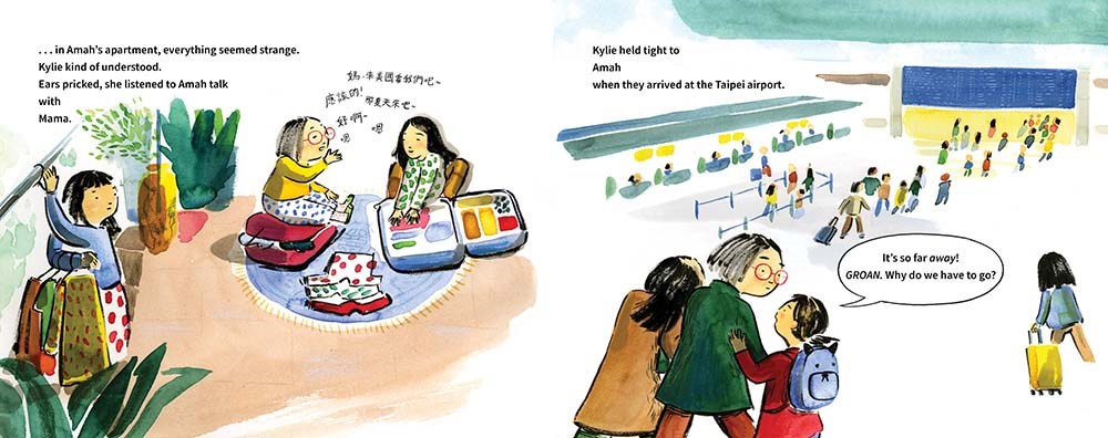 Part of reason why Kylie adapts to a new environment is that Amah loves her home and expresses that joy as she shows her granddaughter the sights of Taipei. Word bubbles in both Taiwanese and romanized letters allow readers to hear Amah speaking in her own language. “The day they visited the hot springs? It was a brand-new day.” Even the joys of a playground have the excitement of the new, as Kylie soars down a slide, from where she “eyed Amah sideways.” Although Kylie’s mother is present, she wisely stands aside, making it easier for her daughter to build a new relationship with Amah. The young girl listens as her mother and grandmother speak together in a foreign language, but, by the end of the trip, even this exchange does no longer excludes her. She is now indelibly connected, in a way which any reader, old or young, knows is true. Amah Faraway presents an unbroken and irreplaceable chain between generations.