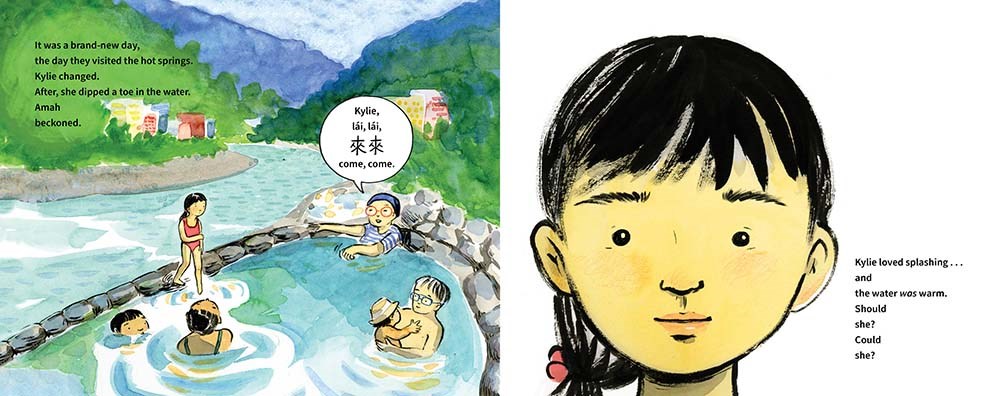 Children will relate easily to this contradiction because author and illustrator present it without apology. Food is different. Chinese donuts, for example, lack frosting, filling, or chocolate. Swimming in natural hot springs seems a bit unnerving. The full-page portrait of Kylie’s face contemplating her challenge, “Should she? Could she?” could be any child trying to summon up courage.