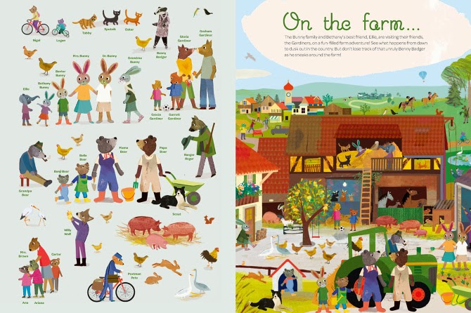 As in her other books (and as in Scarry’s), there are several different species, but a bunny family is at the center. Other animals are depicted through their relationships with Dr. and Mrs. Bunny, their two children Baxter and Bethany, and their grandma. Readers are cautioned to look out for “that pesky Benny Badger,” who “is always up to no good,” although the no good he is up to doesn’t threaten the community’s overall stability. There is no actual plot, but there are suggestions of one, as when Grandpa Bear is “keeping company” with Grandma Bunny when both families visit the Gardiners’ farm. Some of the animals seem indeterminate; I’m not sure if the Gardiners are foxes. Everyone is stylishly dressed, regardless of their profession. If you recall, the workers in Babar’s Celesteville have all the specific gear associated with their jobs, but here simple lines and well-tailored outfits belong to everyone. Grandma Bunny wears green in different shades, and a pink scarf. It’s impossible to tell if she is the maternal or paternal grandmother by the family features.