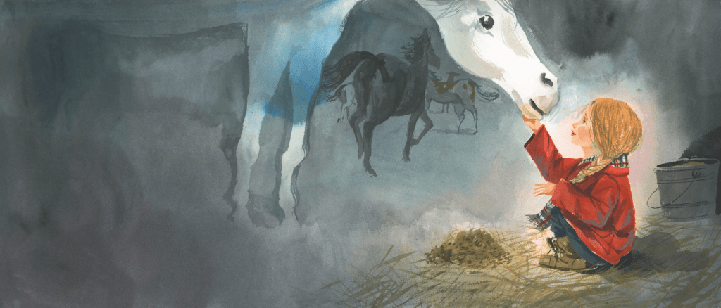 The bond between Clara and her mother is distilled in one concise picture, where her mother asks her to name the new foals. . Clara looks up at her mother, whose face is full of love as she allows her daughter to choose words. Clara “moves her pencil up and down and all around.” For someone confronting difficulty with language, each word is freighted with tremendous significance. Midnight is Moon’s sighted companion, helping to guide him when the other horses fail to understand his puzzling movements.