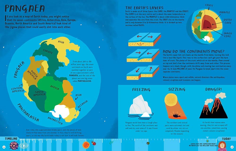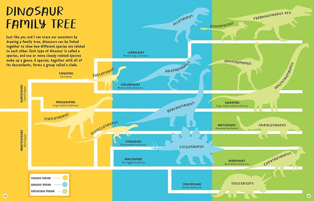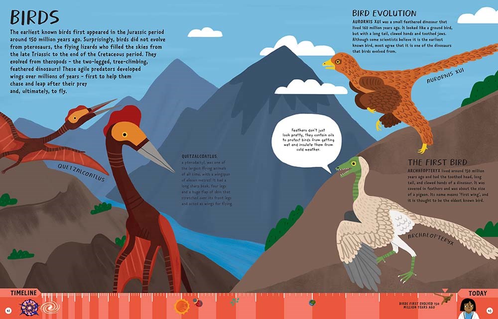 One of the most impressive aspects of this guide is how the author and illustrator presents and develops an overarching and consistent theme, without either intimidating or patronizing children. Beginning with a brief introduction and a friendly invitation to learn more, she starts with empty space and then depicts the Big Bang as a colorful exploding ball. The bottom of every page provides a continual timeline, automatically placing each stage and episode in context. There is plenty of attention given to everyone’s favorite dinosaurs, with detailed descriptions of each age and species, but also a family tree carefully linking each species, genus, and clade (a species plus its descendants). You may have read other dinosaur books with your children and students, but this one fills in many gaps.