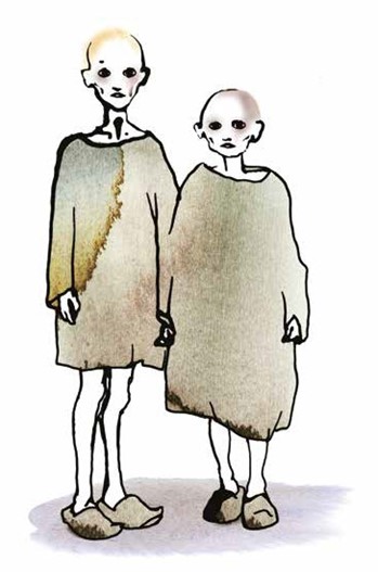 Hédi’s life is shattered when Hitler comes to power. Unlike the vast majority of picture books illustrators, Stina Wirsén has chosen to directly portray the dictator. His horrifying face emerges from the radio in a dark cloud. It appears again, even larger in scale, looming behind the terrified girl and her mother as they walk with arms raised, at gunpoint. Once Hédi and her sister are interned, Fried’s description is a careful distillation of the facts, while still avoiding some of the most terrifying truths. The prisoners are cold, hungry, thirsty, scared. Their uniforms are dirty and their shoes, hard wooden clogs. Wirsén’s picture shows emaciated figures with shaved heads standing behind barbed wire. Descriptions of the actual mass murders are avoided, but neither words nor pictures are sanitized.
