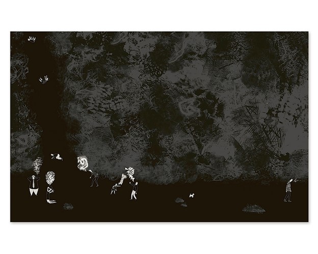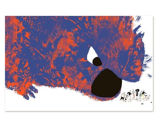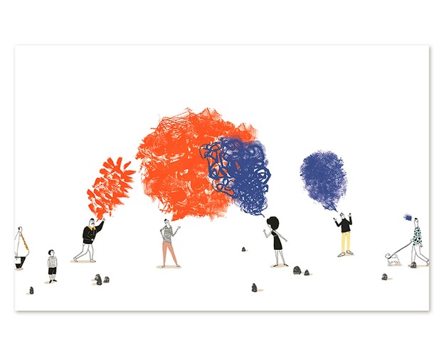A man and a woman disagree. Instead of words, uneven swirls of color emerge from their minds and mouths. Others join in, contributing their own incomplete perspectives and a range of emotions, which seem to correspond to hostility, confusion, puzzlement, and other less easily identifiable feelings. Even children participate in this frightening Tower of Babel. The cumulative range of frightening discord is personified as a monster which dwarfs a miniature mass of fleeing humans unable to resolve their differences.