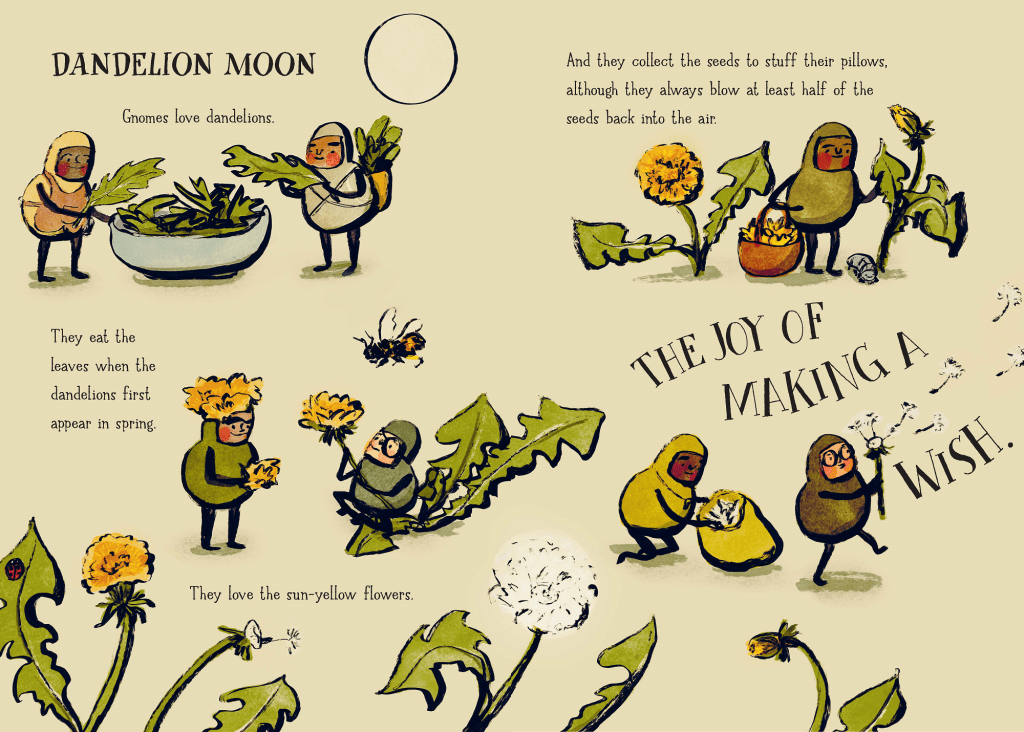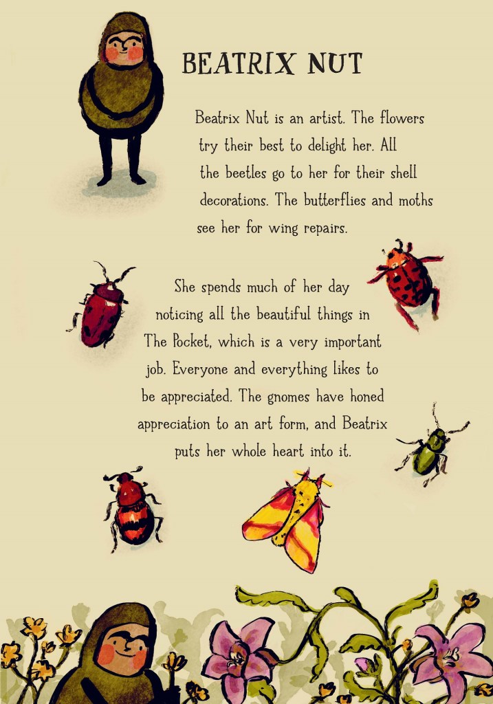 This book as 96 pages. You can read it all at once, or by individual sections. It is not a sequential narrative, but an introduction to a fantasy world people by hidden folk, with names such as Puckle Swift, Cob Tiggy, Hotchi-Mossy, and, of course, Beatrix Nut. As Soloy helpfully points out in her greeting, “Their hearts may seem small, but actually they are big enough to hold the entire world and al the plants, animals and fungi that live there.” Note the specificity of her definition. Each gnome is a unique individual but they inhabit a community, just like the rest of us. They employ a lunar calendar (like some of us), dance and sing spontaneously, and use a variety of tiny implements made from both the natural and artistic worlds.
