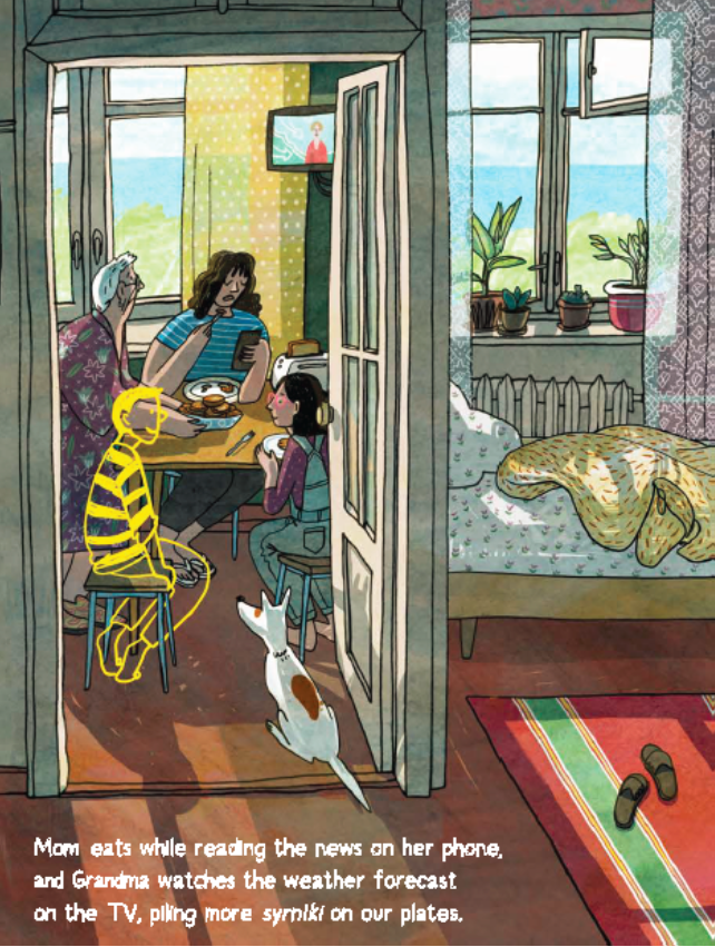The endpapers open a chart of Morse Code, a language that bridges the divisions of nationality. There is a map of the Kamchatka Peninsula, and an image of Vera. Like all the characters in the book, her physical features are keys to a distinct personality. Oversized glasses perched low on her hose, a self-conscious smile, and a pair of overalls over her purple shirt introduce a particular child in a remote place. To expand on her portrait, Anna Desnitskaya presents a group of artifacts that form a kind of museum of Vera’s life. She uses a flashlight on her searches, keeps a collection of feathers, and reads C.S. Lewis. She is not alone, as evidenced by her grandmother’s delicious cottage cheese pancakes, and the support of a mother who is “smart and funny,” clearly two essential qualities.