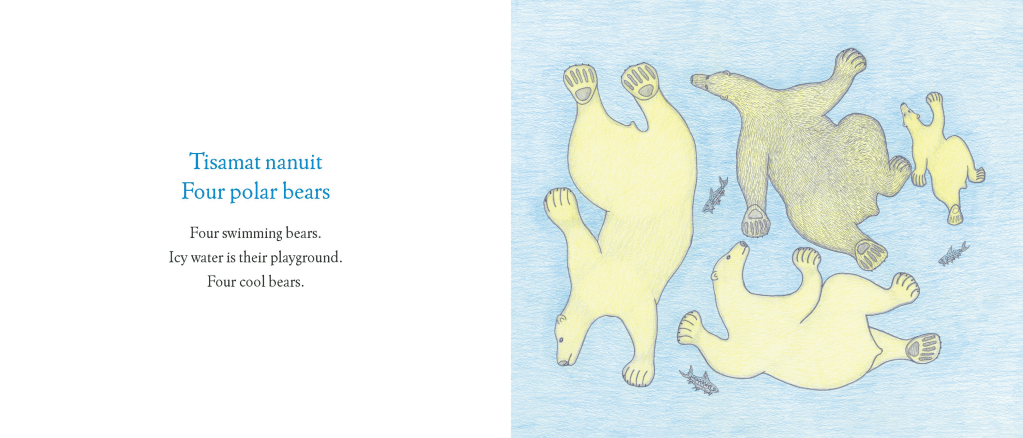 Opening the book, the illustrations have a kind of silent beauty. Once you begin reading, the rhythmic words seem to set the bears in motion. Pootoogook’s artwork is rendered in colored pencils. This is a medium which is both flexible and demanding. The color palette is deliberately limited, with blue and white backgrounds and pale yellow bears. Each bear is filled in with hatching, closely drawn dark vertical and horizontal lines. They have personalities, with the first bear being proud, tall, and long. As more bears enter, the pictures are full, but not crowded. “Four swimming bears./Icy water is their playground./Four cool bears.” The scene is both realistic and stylized, with the bears forming a pattern around the fish who share their home.