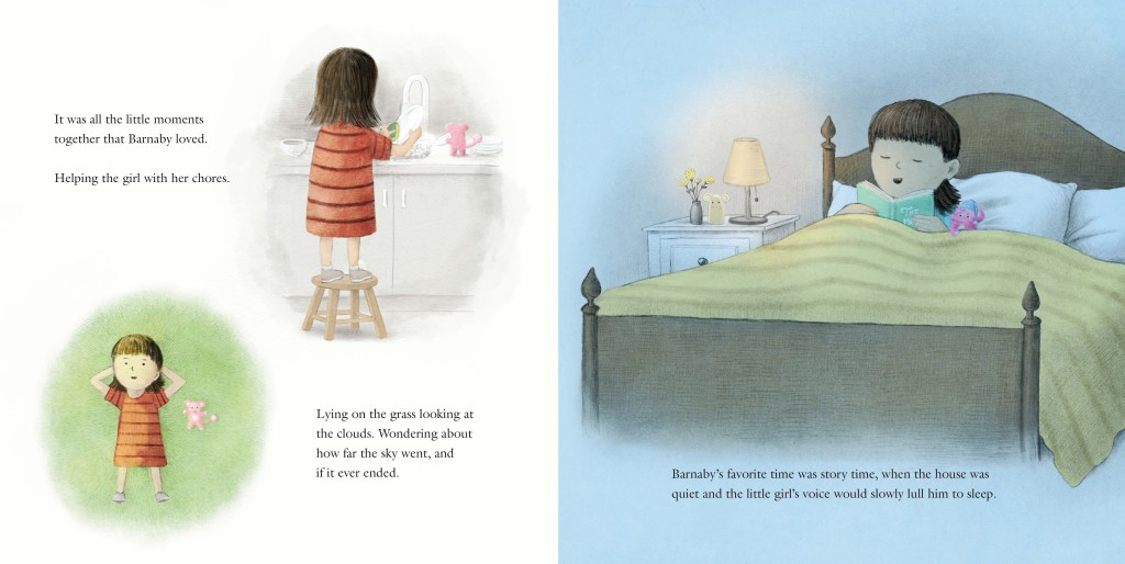 Barnaby is transformed from an insecure toy on a shelf to a beloved friend. He and the girl do everything together, including, of course, reading a story at bedtime. They take leisurely walks in the park, unfazed by the “paparazzi,” otherwise known as squirrels. Then, “everything changed,” as Rainbow Barney debuts on the latest children’s t.v. show. The little girl had seemed loyal, but suddenly she is asking for an elephant with stripes. She ignores Barney, even delegating the task of walking with him to her father, who is so inattentive that he barely notices threatening cats. It’s a toy’s nightmare.