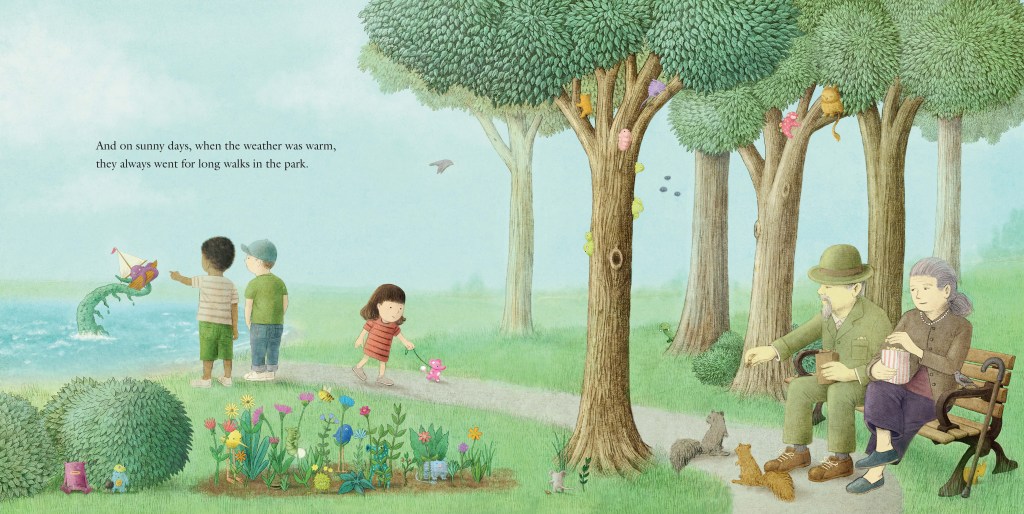 It turns out that the little girl is not fickle. She was just temporarily distracted by the commercial interests whose job it is to pry children from their favorite toys in favor of new ones. Soon they are back together, taking spa baths and eating favorite foods. Of course, they return to the park, full of welcoming nature and fantastic beings. There is even a kind older couple to keep the paparazzi content.