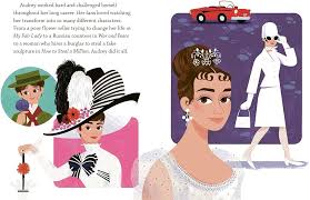Audrey is on the cover in her little black dress and pearls from Breakfast at Tiffany’s. In the World War II section, she wears a plaid dress and a lavender scarf as she gladly accepts chocolates from an American G.I. He is down on one knee as he presents them, as if proposing marriage. Well, she is Audrey! Scenes from Funny Face show case both her gorgeous Givenchy gown, and the classic black turtleneck and cigarette pants with white socks worn for her Beatnik-inflected dance number. It will be fun to explain the cultural significance of these to the children sharing the book with you.