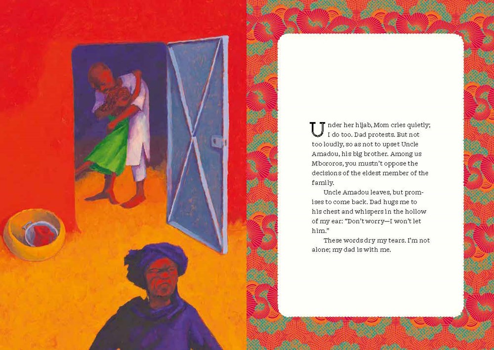 The book is not composed only of words, but of images that organically emerge from the culture which they represent. Pages with illustrations alternate with blocks of text set against traditional fabric patterns. Human figures allude to sculpture but have kinetic movement. Earth tones are the setting for the book’s quiet drama, with deep blue sea and red skies framing Adi’s journey. Adi of Boutanga is not a moral lesson, but a work of art that interweaves modern aspirations of freedom for women with the unique threads of a specific culture. It is a book to read, share with children, and read again.