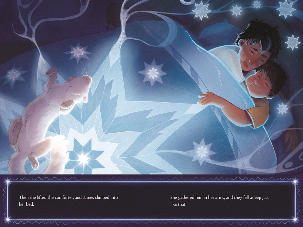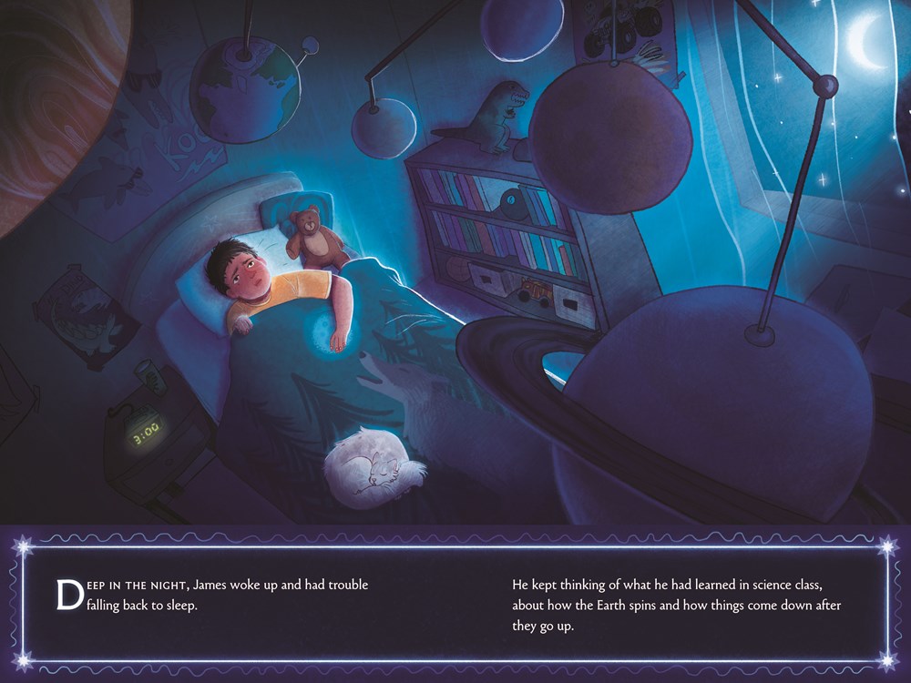 The endpapers feature constellations, introducing a central theme of each person’s place in the universe. James, who understands the principles of astronomy from his science class, opens the curtains in his room to the moonlight. He asks his mother to clarify how and why his feet remain firmly on the ground if the Earth is spinning in space. The answer is only one of several which his mother will frame truthfully, and also use to elaborate on other questions which will naturally follow. She reassures him that his Kōkom’s, (grandmother’s) explanation about their origins is valid, but adds, “even though you’re from the stars, your home is right here with me.”