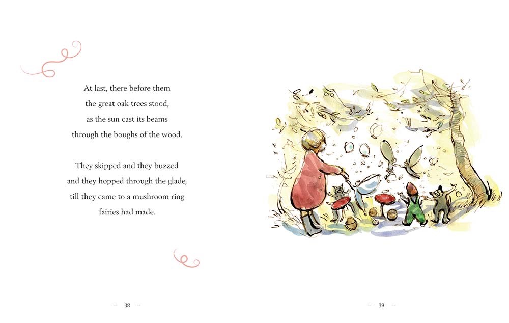 Charlie Mackesy‘s ink and watercolor illustrations, like those of Quentin Blake and Edward Ardizzone, use caricature, ranging from gentle to somewhat frightening. Each character’s distinctive traits emerge from delicate brushstrokes and changes in hue. Mrs. Plumcake ponders how to respond to rude Mr. Pratt, her arms crossed and world bubble above her encasing the essential items: honey, a horseshoe, and a ten-pound note. Fairies and gnomes are easily identified from their roles in folklore, but not limited by them.