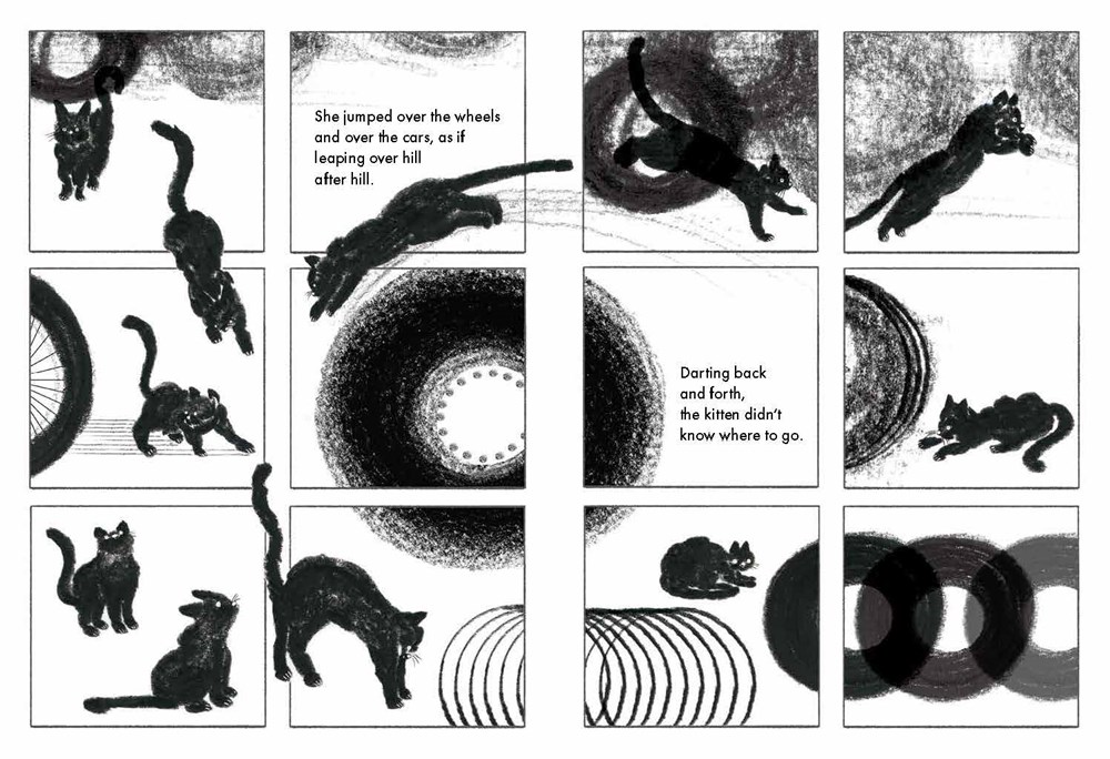Jungyoon Huh’s minimalist text (ably translated by Aerin Park) conveys just exactly the amount of information needed. Myungae Lee’s illustrations, rendered in colored pencils and oil pastels, combine black and white scenes, graphic novel panels, and earth and jewel tones against white background. They are beautiful in their simplicity, but also convey motion, sense impressions, and the imminent threat of losing a kitten on a traffic-clogged bridge. The black font ranges in size, with some pages reminding me of the lettering used in Margaret Wise Brown and Leonard Weisgard’s The Noisy Book, and sequels. (The Winter Noisy Book is illustrated by Charles G. Shaw.)