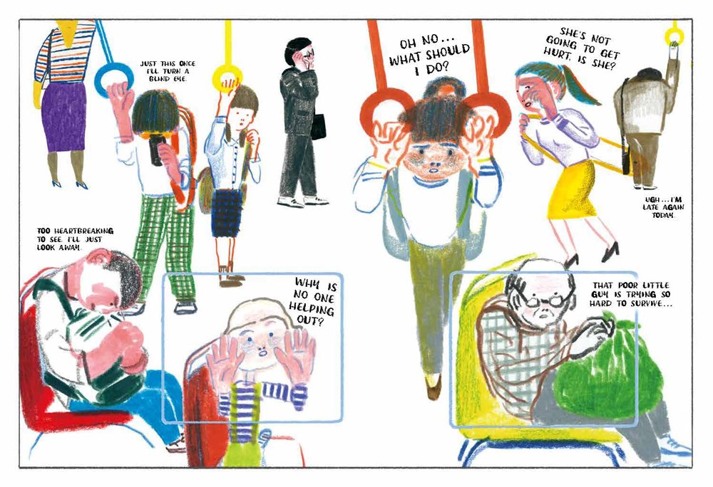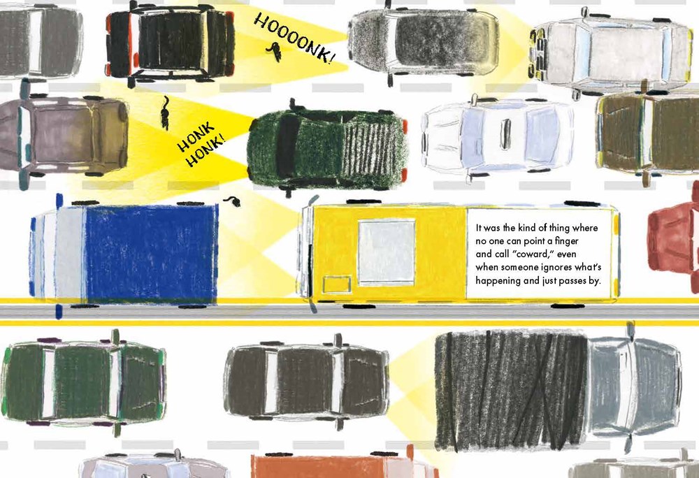 Public transportation passengers, each in isolation, express their own thoughts about the danger, and their appropriate response to the kitten’s plight. Parents and caregivers sharing the book with children will want to discuss all the implications of these natural, but possibly inadequate, emotions: “Why is no one helping out,” “Too heartbreaking to see. I’ll just look away,” and Oh no…what should I do?” One incredible two-page spread is a bird’s eye view of the vehicles, each one inadvertently threatening the tiny kitten weaving between them. The text is enclosed in a rectangle similar in size to the vehicles themselves, the words visualizing the ominous situation.