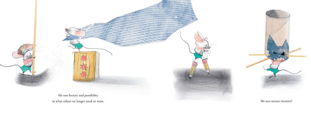 Since mice have large families, Spaghetti has a rapt audience for his pencil stilts, cat face costume, and even his carefully composed box of cast-offs waiting to find a use. Yet other members of his clan are annoyed by his endless projects. Mummy complains of the mess and Daddy makes the puzzling statement that “You have too much treasure”” as if that were possible. Spaghetti responds with conviction, and even a hint of defiance, literally immersing himself in the multicolored materials he will bring to life.