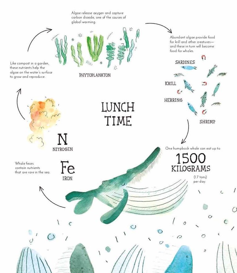 If you come to the book with some basic knowledge of humpback whales, you will still learn a great deal. Nothing is necessarily obvious, including the basic fact that every part of the environment is related to one another. “Nothing that happens in the water does so in isolation.” “Lunch time” involves a nutrients provided by algae, sardines, and krill.