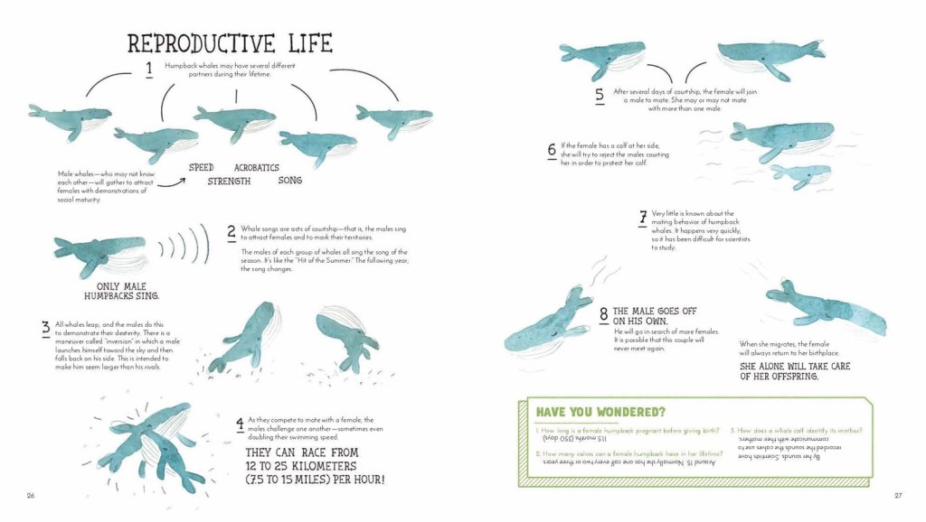 Steps numbered in sequence give the facts and also allow the reader to draw her own conclusions. “She alone will take care of her offspring.” The “Have You Wondered” section reveals how a calf learns to identify its mother. The book’s backmatter declares that it was created by “a team of people who love whales.” By this point, you will not have any doubt of that essential fact.