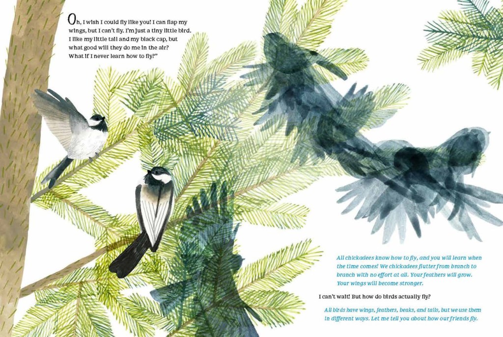 A young chickadee expresses concern about the possibility that she will never accomplish the daunting task of learning to fly. Ptashnik captures the inner life a child with her words: “I can flap my wings, but I can’t fly. I’m just a tiny little bird…What if I never learn to fly?”