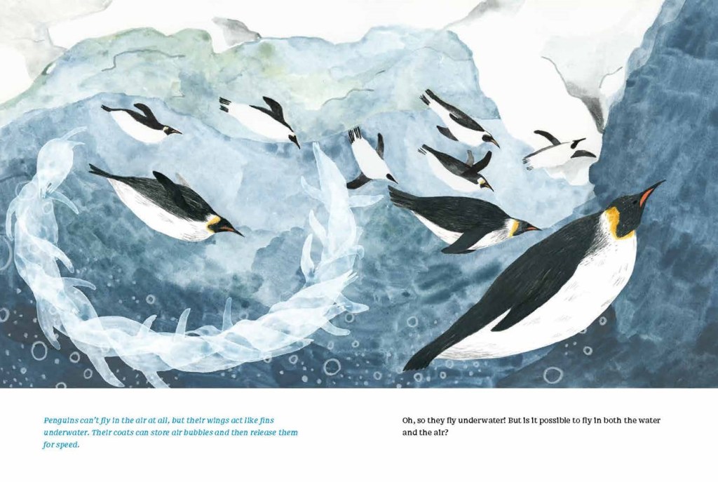 Hummingbirds are tiny; how do they produce the intense vibrations that give them their names, and also find nectar to drink? Penguins can’t fly, but their speedy swimming more than compensates for this unusual difference. The young bird processes the information: “Oh, so they fly underwater! But is it possible to fly in both the water and air?”