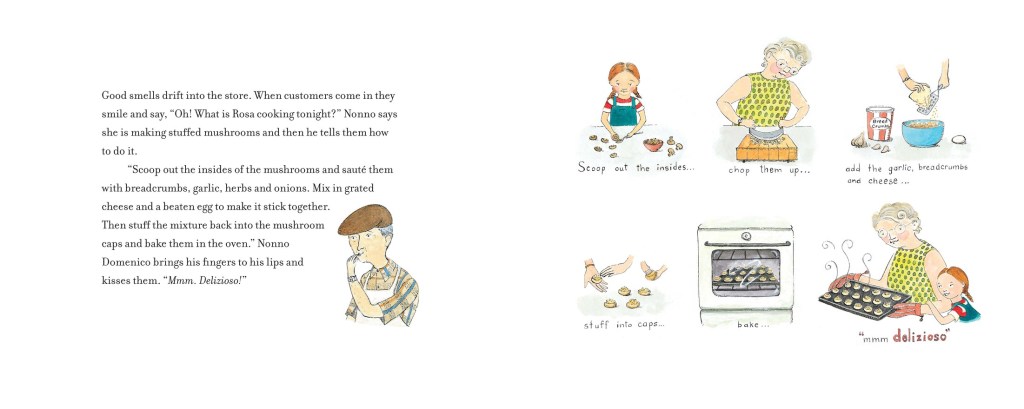 Every picture in the book stands alone as a work of art, and also advances the building of characters. The delicious smells filling the store attract customers, who ask Nonno what dish Nonna is cooking. He recites the recipe, and then completes his expression of love, raising his fingers to his lips and kissing them. A visual timeline of the stuffed mushrooms’ creation appears on the facing page. The entire book is delizioso.