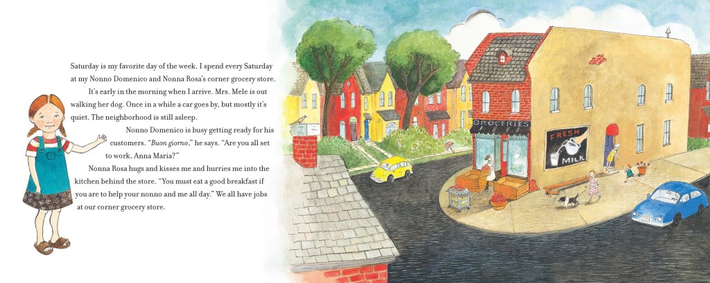Detail defines Beingessner’s illustrations, along with careful composition and bright colors. Anna Maria is precise in her descriptions. She traces her steps: “There are only two short aisles in our corner grocery store. When I come inside, I have to close the boor before I can get to the counter.” An adult might minimize the need to establish scale this way, but to a child it matters. The bottom of the page with text sets out several small items, including a box of paints and a slice of pizza. On the facing page, the store becomes a cutaway doll house, with each room individually constructed. You will want to look at this page for a long time, noticing the floral upholstery on the armchair, Nonna in her green dress making coffee, and the incredible array of miniature products juxtaposed on their shelf.