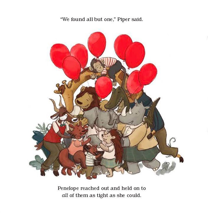 A word about Babar seems required. Any children’s book presenting anthropomorphized elephants seems, to some extent, an homage to Jean and Laurent de Brunhoff. Certainly, some of her animal friends include monkeys, rhinos, and other residents of Celesteville. (Although the rhinos are not bad guys here.) Penelope is certainly less sophisticated and cosmopolitan than Babar, but there is still a sweet reminder of how animals with human qualities offer a unique connection with children. There is more than one lesson in Penelope’s Balloons, and the book is well-worth sharing with them.