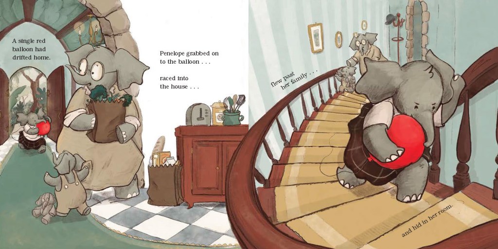 Children can become attached to unexpected objects. Some, like balloons, have a limited life span. In Penelope’s Balloons by Brooke Bourgeois, a young elephant who is “quiet…bright,” and “a bit particular,” cannot let go of ten red balloons, either literally or figuratively. She is happy lying on her back and watching them suspended in the air, but also keeps them close while eating or diving.