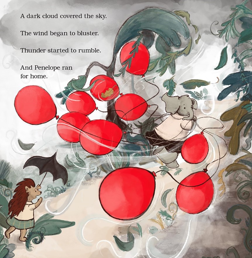 From the beginning of the story, it seems evident that there will be both a problem and a message here. Penelope’s balloon obsession does not prevent her from socializing, In fact, she has many friends of different species. The balloons only make her more “perceptible” and popular, to choose another adjective that is alliterative with her name. The problem is the fragile nature of her favorite item. Her best friend, Piper, is a hedgehog; say no more. Allie is an alligator with sharp teeth. On the other hand, Gerry the giraffe is a good friend to have, her long neck offering some protection from potential piercing.