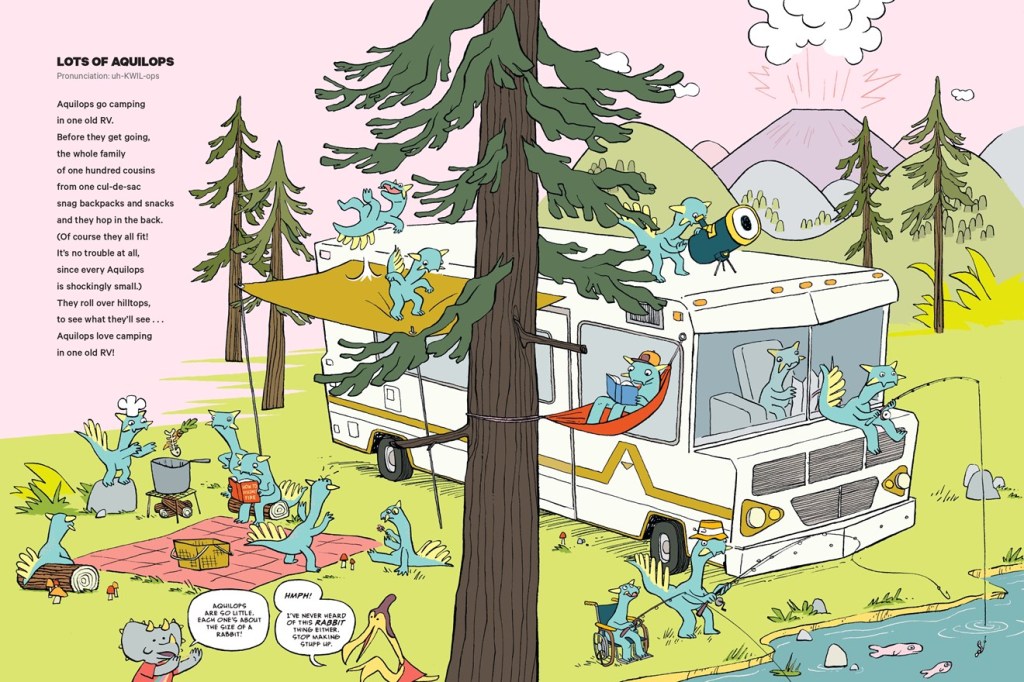 If dinosaurs as country music performers seems a stretch as long as a Titanosaur’s tail, the weeping, boot-wearing, Iguanadon may convince you otherwise, with his sad lament about being ditched for a Hadrosaur, the one with a distinctive duck bill. The Aquilops in their camper are an adorable reminder that not all dinosaurs were huge. One hundred Aquilops cousins easily fit in their RV, toting “backpacks and snacks.” After all, “Aquilops are so little, each one’s about the size of a rabbit!”