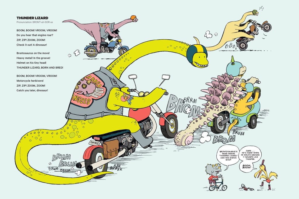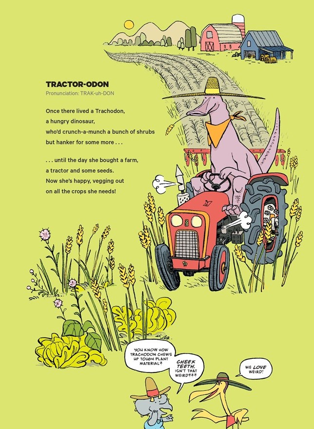 This fanciful and funny book of illustrated poems operates from the premise that dinosaurs engage in a number of human activities. In Dustin Harbin’s clever drawings, they drive tractors, trucks, and buses. They take care of kids, race motorcycles, and ferry fares across the city in taxis. Simultaneously, conversations in word bubbles between other dinosaur characters present accurate information about these prehistoric beasts: “Confession time: Pterodactyls aren’t dinosaurs! They’re actually part of a group of flying reptiles called ‘pterosaurs.’”